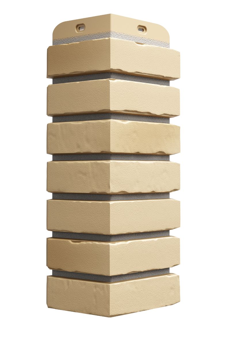Углы «монте» — идеальное дополнение для фасадных панелей с имитацией кладки из белого клинкерного кирпича. Плавный переход цвета от уютного бежевого к натуральному доломитовому оттенку сделает стык панели и угла практически незаметным.